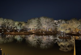 - 조명이 비치는 벚꽃과 고즈넉한 연못이 만나 동양화 같은 장면을 연출해요.